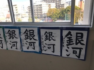 6年生の教室前廊下や壁には習字の毛筆作品「銀河」が掲示されています。