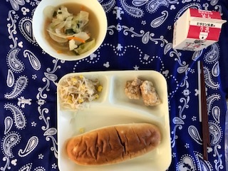 12月11日の給食は「おさつパン・牛乳・鶏肉のからあげ・中華みそスープ・もやしとコーンの甘酢あえ」でした。