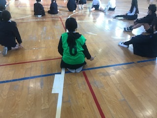 この日はなかよし班の中から3学年が集まっての2回目の集会です。体を動かしたり、密集したりするような活動はできないため、距離をあけて、円形になってクイズに答えました。