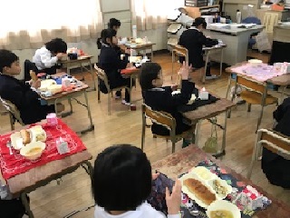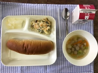 8日の給食は「こくとうパン・牛乳・ほたて貝のグラタン・スープ・和なし(カット缶)」でした。