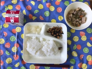 1月12日の給食は「ごはん・牛乳・筑前煮・ひじき豆・だいこんのゆず風味」でした。