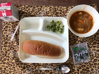 1月13日の給食は「こくとうパン・牛乳・ビーフシチュー・ブロッコリーのサラダ・ミニフィッシュ」でした。