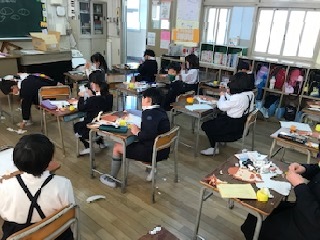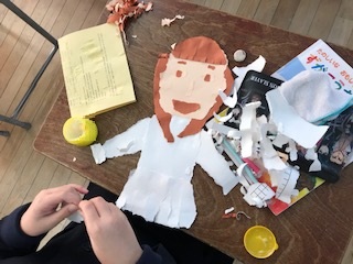 2年生は紙をちぎって重ねて貼り、版を作っています。何をしているところかは自分たちで考えます。それぞれ動きが変わってきますので、作っている最中の版もそれぞれです。できあがりが楽しみです!