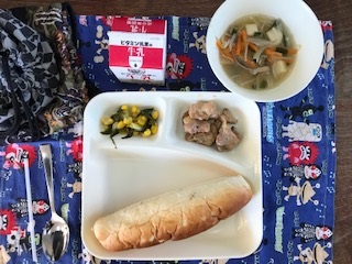 1月15日の給食は「おさつパン・牛乳・鶏肉のオイスターソース焼き・中華スープ・チンゲンサイとコーンの中華あえ」でした。