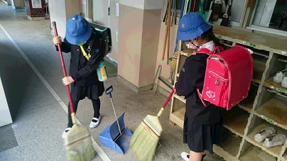 6時間目が終わり、子どもたちが下校していく中、1階の廊下で4年生の女の子二人がほうきをもって砂ぼこりを掃いていました!!