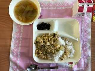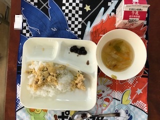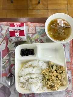 1月19日の給食は「ごはん・牛乳・親子丼・すまし汁・黒豆の煮もの」でした。