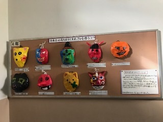 4年生は2学期から図工の時間にお面づくりをしていました。大阪府の有形民俗文化財の一つである「おむかえ人形」について学習した子どもたちは、中本小学校の伝統を守り、盛り上げていくために、一人一人がイメージを膨らませ、個性あふれる人形(お面)を作ってきました。思いの込められた作品は今にも動き出しそうです!!