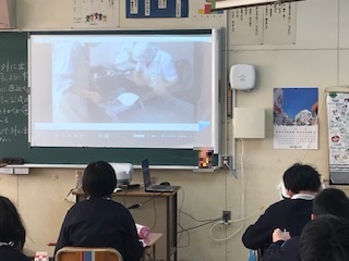この日は中本小学校「給食感謝デー」ということで、特別にある日の給食調理室の様子を撮影し、映像で見てもらいました。子どもたちは軽快なBGMが流れているので、「楽しそう」と、少し勘違いもありましたが、下ごしらえから調理完了までを見ることができ、興味いっぱいでした!!