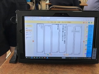 コラボノートは、別々のタブレットで活動していても、それぞれの画面にグループの作ったものや書いたものが更新されていきます。協働で学習できるメリットがあります。