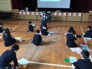 4時間目には2年生が講堂で、折り紙を教えてもらいました。テーマは「チョゴリ」です。