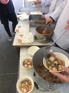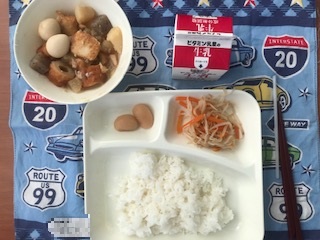 2月2日の給食は「ごはん・牛乳・関東煮・甘酢あえ・白花豆の煮もの」でした。