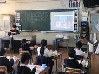 この日の給食中、1時間目の「韓国・朝鮮の文化にふれるつどい」の発表映像をみているクラスもありました!