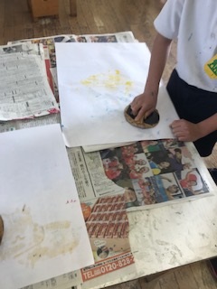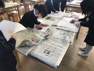 3年生の制作中の版画「でこぼこを利用して」の版ができあがり、今日は転写作業です。版にインクを塗り、上から版画用紙をのせて、ばれんですりました。