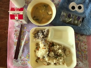 今日2月4日の給食は「ごはん・牛乳・鶏ごぼうご飯・みそ汁・焼きれんこん・きざみのり」でした。