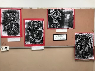 学校生活の中でいろいろなことを学び、体験したきた1年生が、版画で表したい動きを考え、版作りを進めました。なわとびや竹とんぼをしているシーン等が題材になっています。顔や体の大きさのバランスを考え、動きをイメージしながら、作った版にインクをのせて、版画は完成を迎えました。