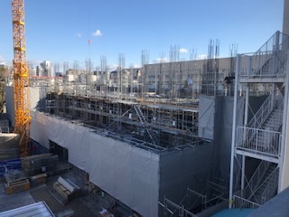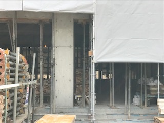 今日のお昼までの校舎建築工事の様子です。鉄筋は3階まで伸びてきており、1階部分はコンクリートの柱も見えます。