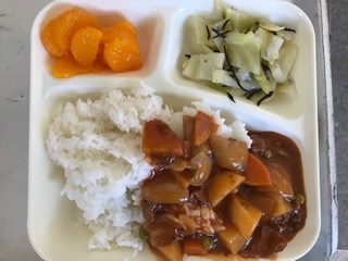 16日の給食は「ごはん・牛乳・ハヤシライス・キャベツのひじきドレッシング・みかん(缶)」でした。