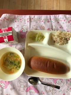 今日の給食は「こくとうパン・牛乳・中華おこわ・卵スープ・キャベツとピーマンのいためもの」でした。