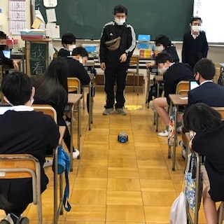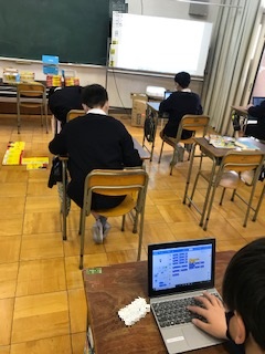 6年生が教室で、一人一台学習者用端末を使って、mBOTというロボットを動かすプログラミングにチャレンジしていました。