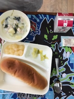 昨日の給食は「コッペパン・牛乳・ほうれんそうのクリームシチュー・キャベツのサラダ・洋なし(缶)・マーガリン」でした。