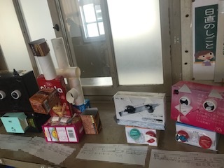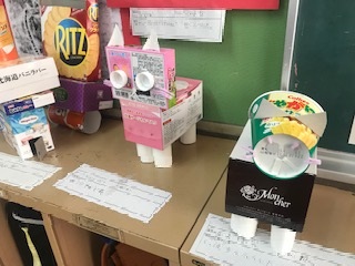 1年生の教室のロッカー上に、かわいらしい個性豊かな作品が並んでいました。