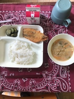 1日の給食は「ごはん・牛乳・いわしのフライ・みそ汁・きゅうりの赤じそあえ」でした。
