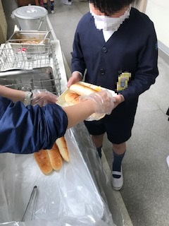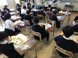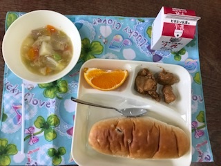 5日の給食は「おさつパン・牛乳・鶏肉のみそバターソース・スープ煮・デコポン」でした。