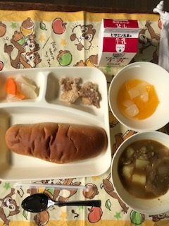 9日の給食は「こくとうパン・牛乳・フライドチキン・カレーシチュー(近江牛)・おいわいピクルス・フルーツゼリー」でした。