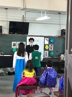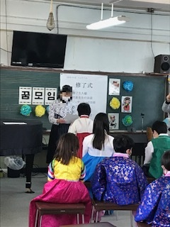 今年度は卒業を迎える6年生2名が最上級生として,普段の活動や校内の集いで披露した劇や踊りの練習ををリードしてきました。たくさんのことを学んだ1年間を振り返り,校長先生やソンセンニムから言葉をいただき,参加児童は修了証を受け取りました。