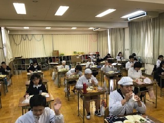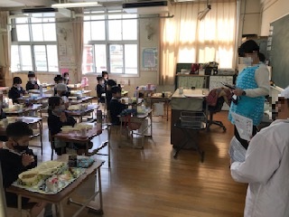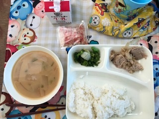17日の給食は「ごはん・牛乳・豚肉のしょうが焼き・とうふのみそ汁・なのはなのおひたし・かつおぶし(パック)」でした。