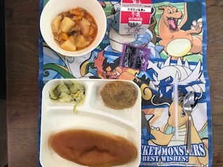 22日の給食は「コッペパン・牛乳・チキンレバーカツ・ケチャップ煮・キャベツときゅうりのサラダ・ブルーベリージャム」でした。