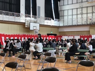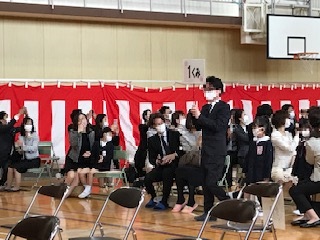 入学式が始まり、1年生の子どもたちは保護者の皆様や教職員に見守られ、しっかり入場できました。