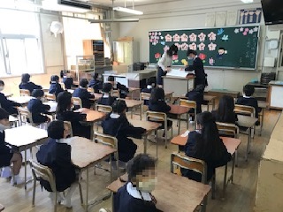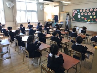 入学式後の教室では、担当の先生が紙芝居を読んだり、一緒に手遊びをしたりして楽しく過ごしました。