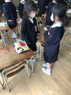 1年生の教室で、一人でも多くの友だちと自己紹介しあう活動が行われていました。それぞれが名前を言い、よろしくお願いしますとごあいさつ。
