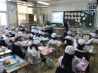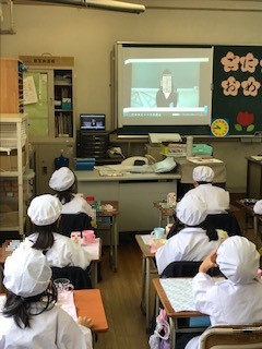 給食の時間に1年生の教室で、2年生から6年生の各クラスで撮影した入学お祝い動画を視聴していました。