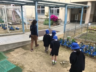 気温が少しずつ上がり、生き物が目を覚ますころ。学校にも春が訪れています。1年生は春を探しに学校を少し探検です。