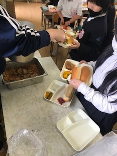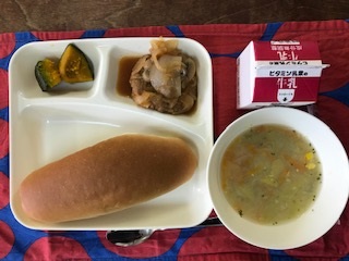 16日の給食は「コッペパン・牛乳・煮こみハンバーグ・コーンスープ・焼きかぼちゃ・いちごジャム」でした。