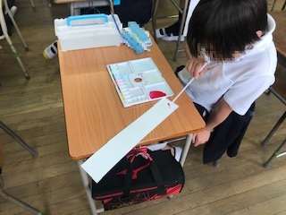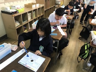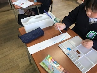 4年生の図工の時間、絵の具で色水をつくり、画用紙に落として、ストローで吹いてみました。すると水が多めの色水は線になって画用紙を進んでいきます。角度を変えながら何度も吹いていると、模様ができました。