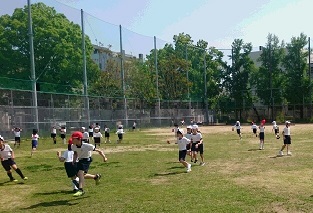 そこで、東中本公園内の運動場で体育の授業を行いました。校外での活動にはなりますが、広い運動場で体力テストに向けて50m走を走りきるための練習が必要でもあったため、実施しました。