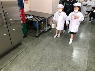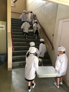 1年生の給食はしばらくの間、6年生が運んでくれていましたが、給食に慣れてきた1年生は自分たちで運搬しています。食器や大おかず等は重たいですが、ペアで協力してしっかり運ぶことができています。