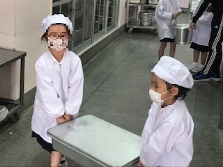 ※26日の給食からは、少しでも感染リスクを下げるため、昨年度と同様に教職員が全学年の給食を運搬します。状況が落ち着いたら、各学級の当番の運搬に戻す予定です。