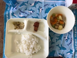 26日の給食は「ごはん・牛乳・まぐろのオーロラ煮・含め煮・キャベツの赤じそあえ」でした。