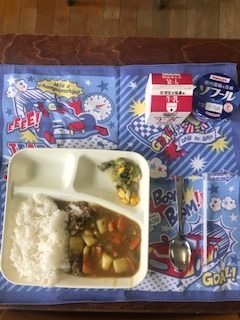 7日の給食は「ごはん・牛乳・牛肉と大豆のカレーライス・レタスとコーンのサラダ・ヨーグルト」でした。