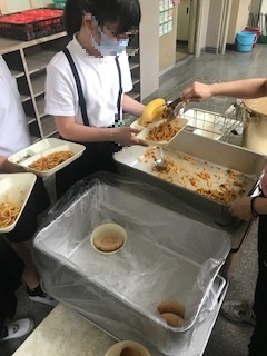 18日の給食は「こくとうパン(小)・牛乳・カレースパゲッティ・キャベツのひじきドレッシング・バナナ」でした。