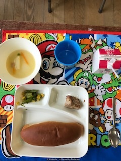 20日の給食は「こくとうパン・牛乳・かつおのガーリックマヨネーズ焼き・ベーコンと野菜のスープ・グリーンアスパラガスのソテー」でした。