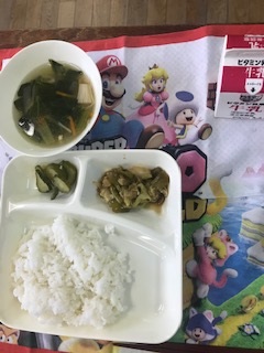 21日の給食は「ごはん・牛乳・ホイコウロー・中華スープ・きゅうりのピリ辛あえ」でした。