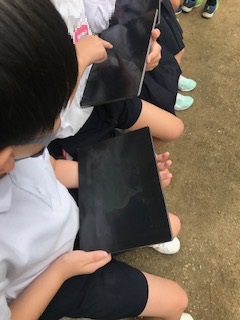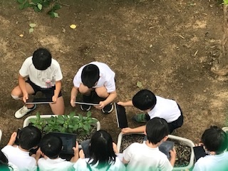 2年生はプランターで野菜を育てています。ナスにピーマン、オクラ・・・。大きくなった葉や咲き始めた花を観察し、学習者用端末で撮影、記録しました。