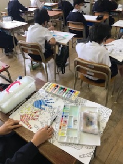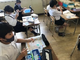 テスト後の5年生の教室では、家庭科の裁縫と図工の制作が行われていました。
