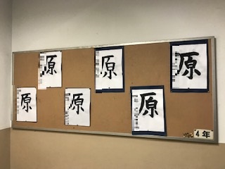 毛筆の学習2年目となる4年生。習う文字も難しくなってきます。今回の「原」は、はらいやはね、文字のバランス等、気を付けて書く箇所がたくさんありましたが、しっかり手本を見て、集中して書いていました!