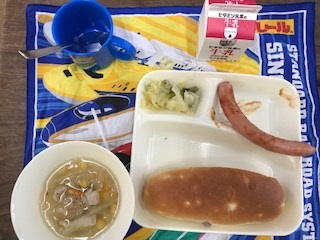 1日の給食は「おさつパン・牛乳・ウインナーのケチャップソース・スープ・キャベツとさんどまめのサラダ」でした。